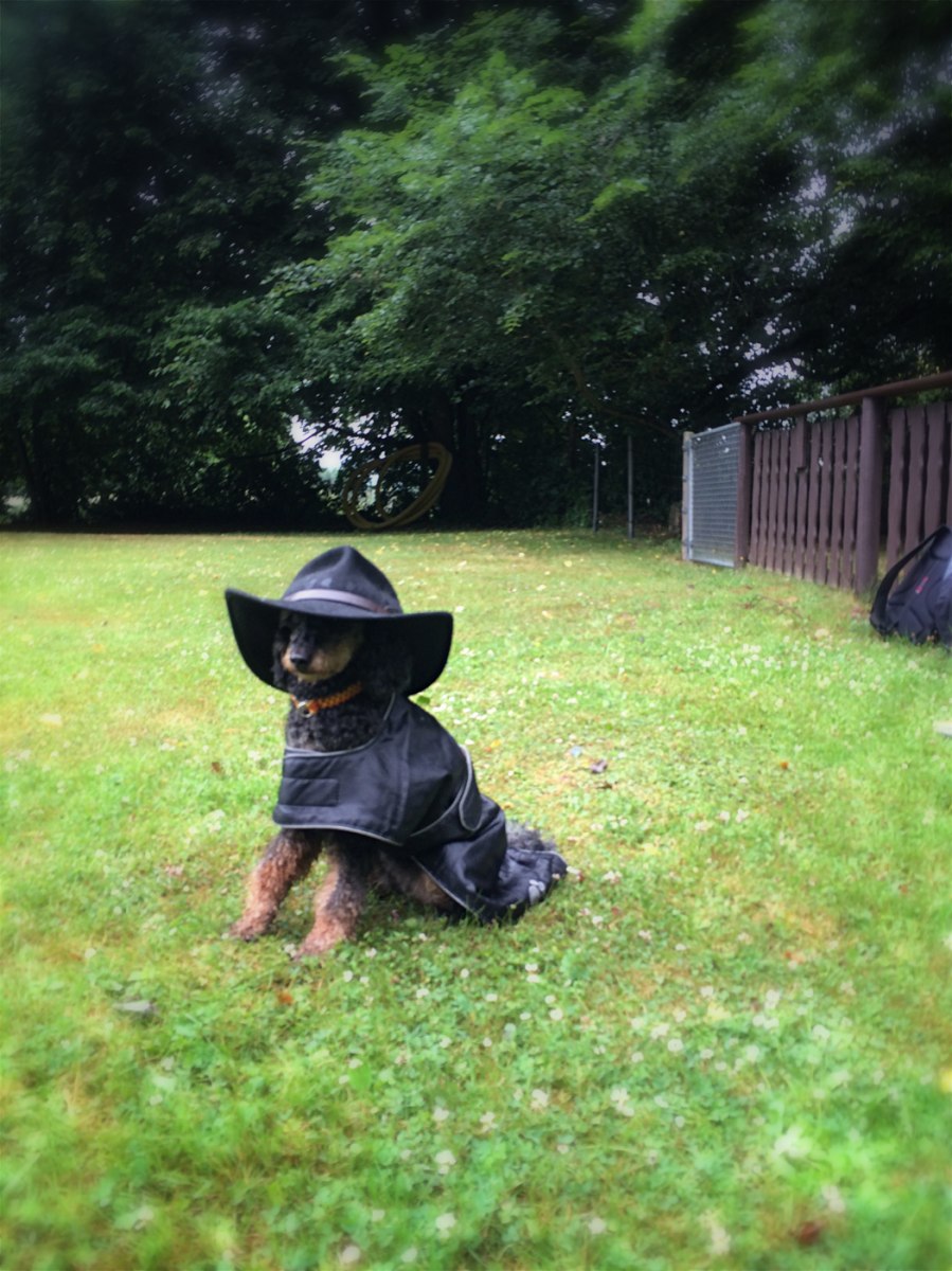 Wir haben gestern im Verein RO trainiert. während Jammi lief und wir warteten wurde der Regen wieder stärker. Hannahs Mantel war gerade nicht griffbereit und so hatte ich Ihr den zu großen von Jammi umgehangen. Als ich den Parcours inspizieren wollten kam sie ein Stück mit, setzte sich auf Stopp wieder. Irgendwie hatte ich einen Trenchcoat im Sinn und dann kam ich auf die Idee mit dem Hut, den ich selbst trug. Und den Quatsch macht die Maus auch mit.